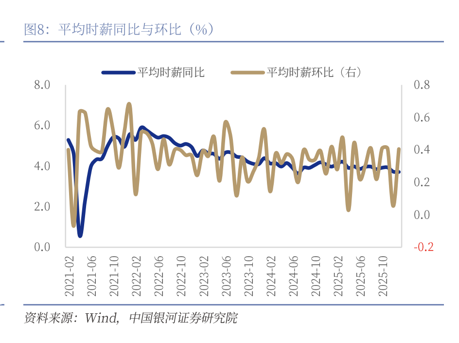 失业率方面,1月失业率较前月回落0.1个百分点至4.3%,好于市场预期。华泰证券指出,在劳动参与率回升的背景下,失业率下行与1月以来首申及续申数据整体优于预期所反映的信号一致。劳动参与率超预期上升0.1个百分点至62.5%,周均工作时长亦超预期增加0.1小时至34.3小时,显示劳动力利用强度有所提升。