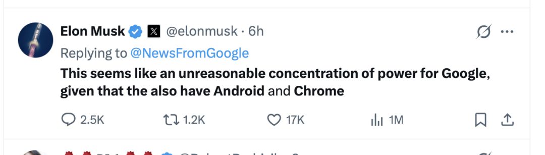 “考虑到谷歌已经控制了Android和Chrome,这样的合作将导致不合理的权力集中。”马斯克在X上写道。